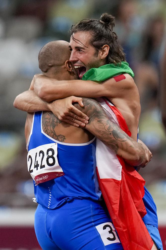 He found just the person a few minutes later when Jacobs crossed the line first. Tamberi leaped into the broad-chested sprinter’s arms and curled his own arm around Jacobs’ bald head.